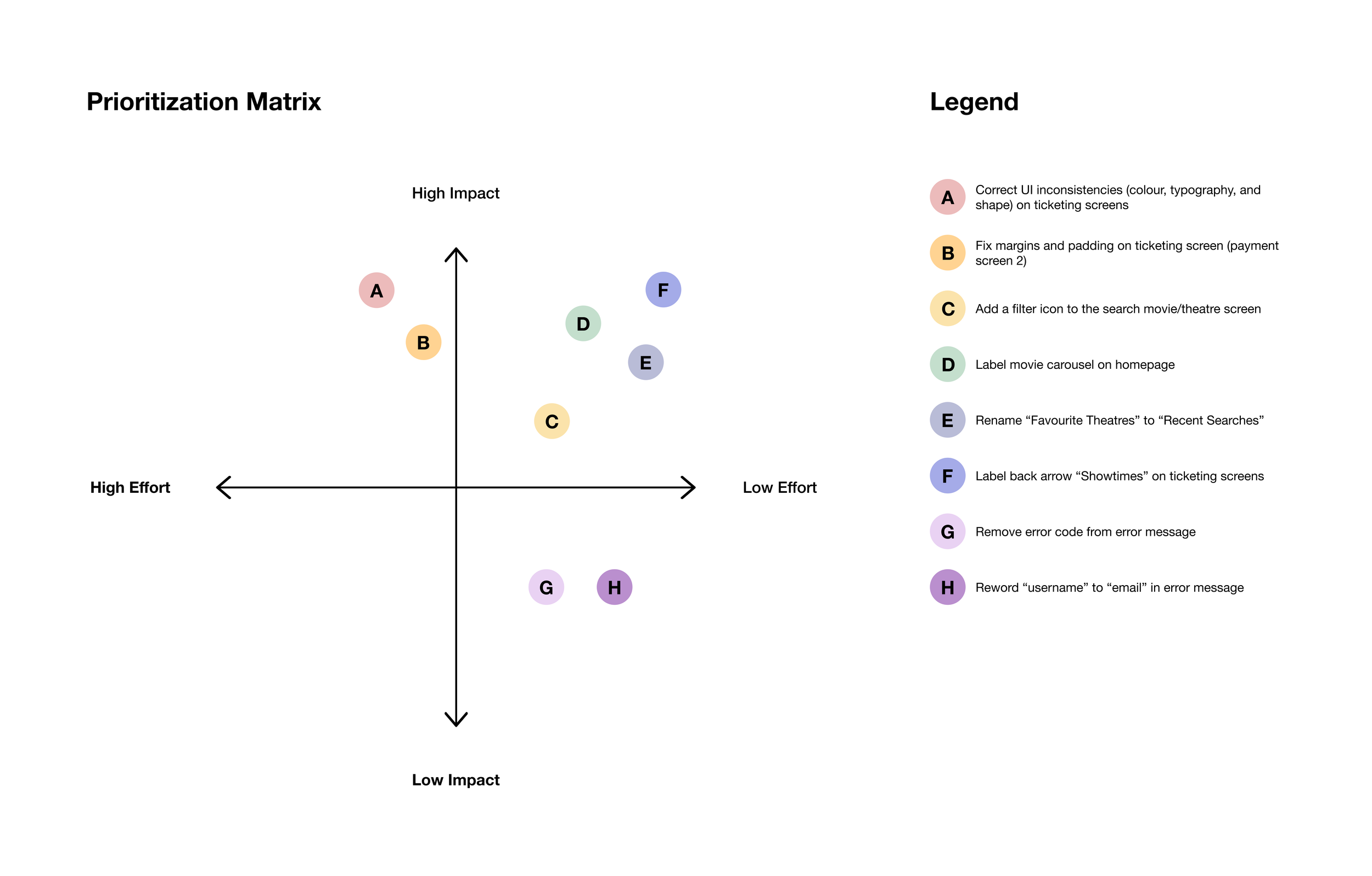 We organized our usability recommendations into a priority matrix to identify which solutions would yield the highest impact while requiring low effort.