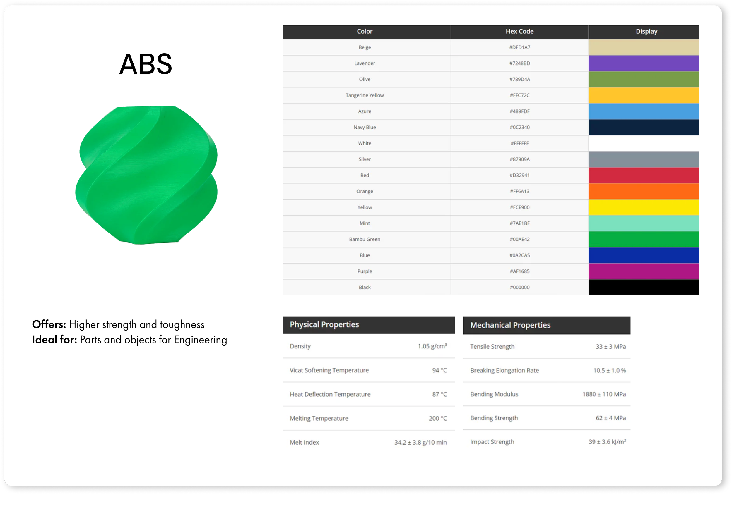 The product cards follow a uniform design structure which allows users to compare finishes and common use cases side by side. Users can also view all color swatches without losing their place. Information about filament properties - available for ABS and ASA only - alters the appearance of the product card but remains familiar.